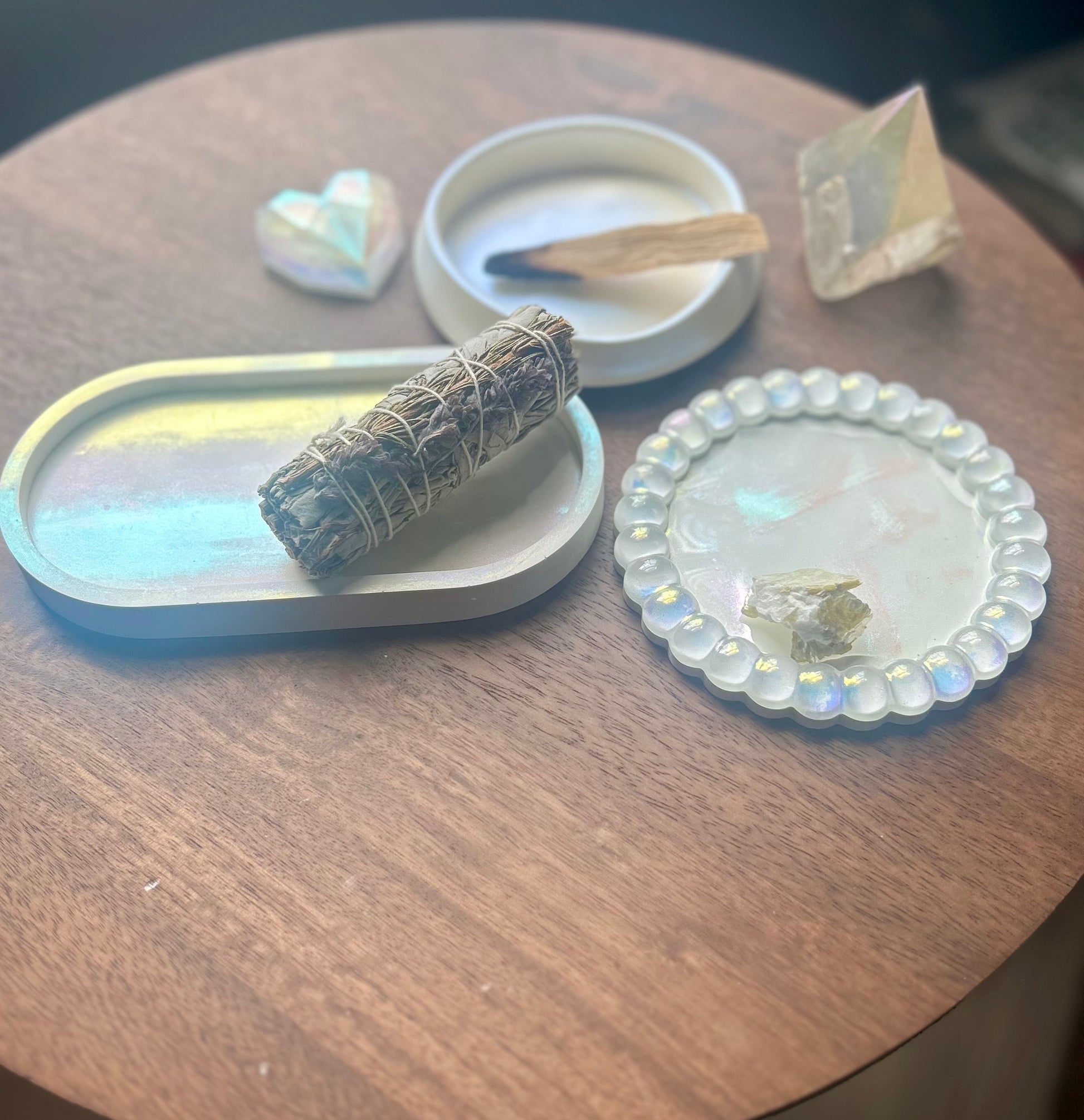 Bring a little magic to your space with this luminous bubble edge dish. Its pearlescent finish catches the light beautifully, shifting between soft rainbow tones. Perfect for holding crystals, jewelry, or small ritual items.